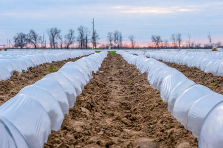 Growing vegetables in small greenhouse under plastic film on the field. agriculture. farmland. high quality photo