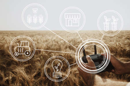 Man farmer standing in wheat field and controlling drone. Technologies in agriculture concept
