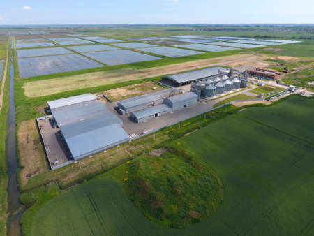 Grain terminal. Plant for the drying and storage of grain. Rice plant in the middle of fields. Top view.