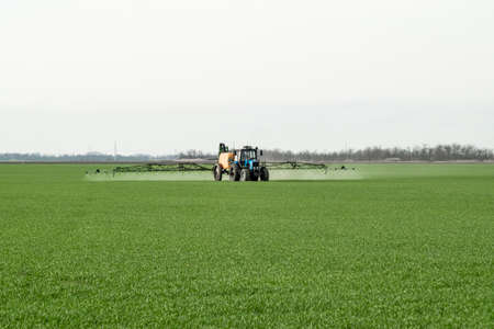 Tractor with high wheels is making fertilizer on young wheat. The use of finely dispersed spray chemicals. Tractor with a spray device for finely dispersed fertilizer.