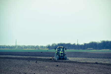 Lush and loosen the soil on the field before sowing. The tractor plows a field with a plow.