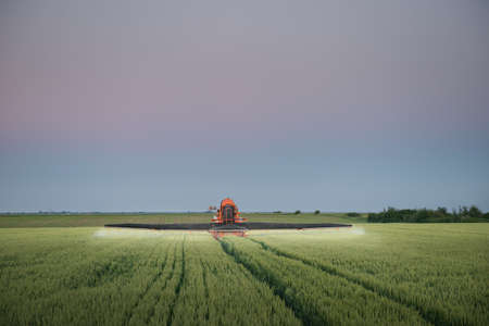 Tractor with high wheels is making fertilizer on young wheat. The use of finely dispersed spray chemicals. Tractor on the sunset background.