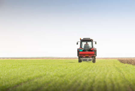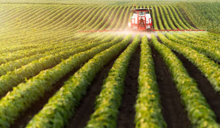 Agriculture tractor spraying fertilizer on agricultural field. Smart agriculture farming, agricultural food crops technology concept.