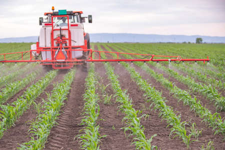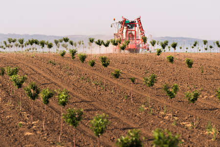 Tractor spraying pesticides on vegetable field with sprayer at spring
