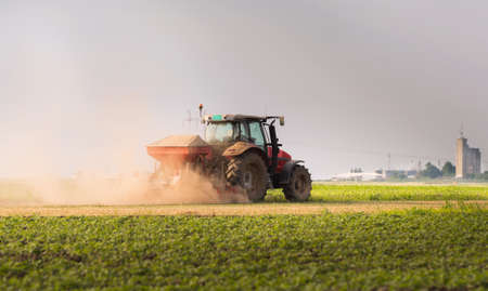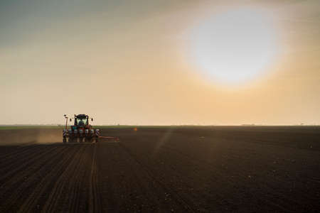 Farmer with tractor seeding - sowing crops at agricultural fields in spring