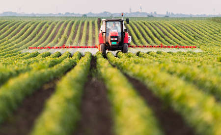 Tractor spraying pesticides on soybean field with sprayer at spring