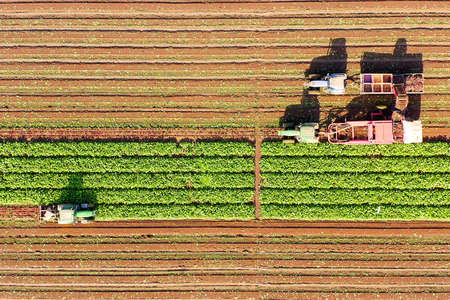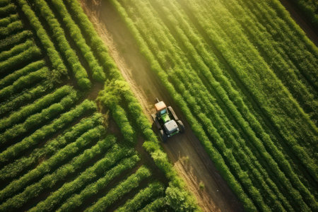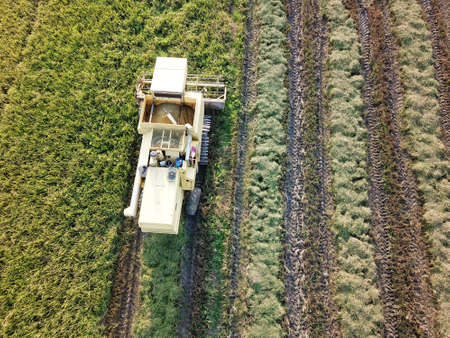An overhead shot showcases an agricultural machine actively harvesting crops in a verdant field. The composition features parallel rows of vibrant green vegetation. A daytime scene with possible commercial applications, it's dominated by the machine's activity and natural environment.