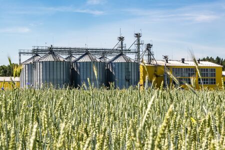 Grain Silos in corn Field. Set of storage tanks cultivated agricultural crops processing plant.