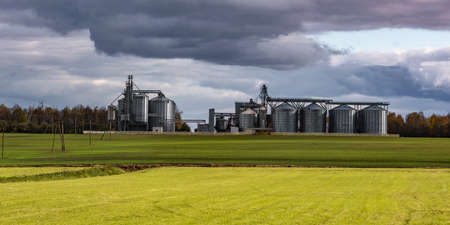 modern granary elevator and seed cleaning line in silver silos on agro-processing and manufacturing plant for storage and processing drying cleaning of agricultural products, flour, cereals and grain