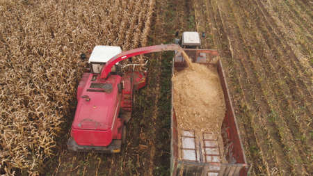 Forage harvester cuts dry corn stalks, threshes the cobs and pours grain from pipeline into tractor trailer. Joint work of agricultural machines