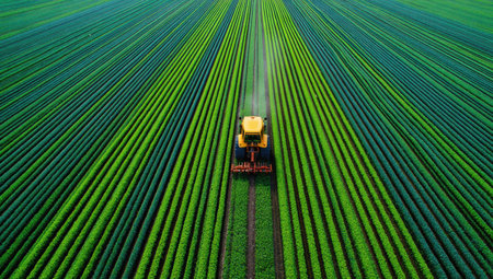 A tractor sprays crops with precision on a large field under a cloudy sky.