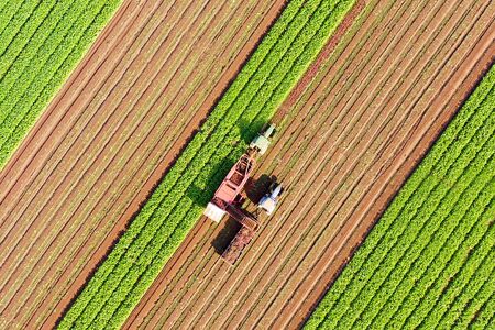Mechanized carrot harvesting.erial view.Machine harvesting carrots moves across the field and loads the carrot truck.Harvest carrots combine and load it into the truck.