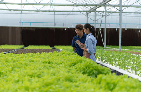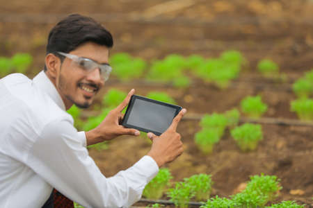 Technology and people concept, Young indian agronomist using tablet or smartphone at greenhouse