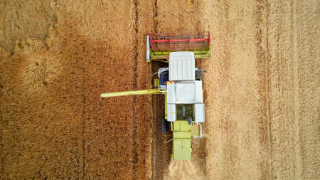 Aerial view of combine harvester working during harvesting season on large ripe wheat field. Agriculture concept