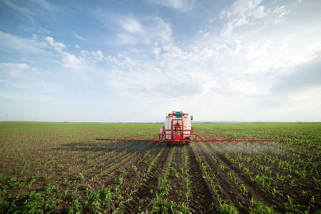Tractor spray fertilize field with insecticide herbicide chemicals in agriculture field