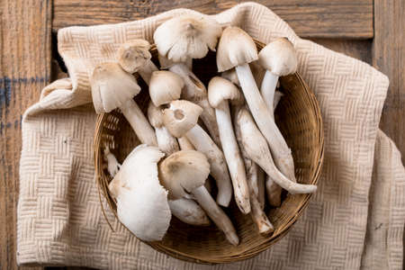 Young fresh harvest mushrooms on wood table background, Concept and idea of food cook rustic still. Raw mushrooms for publication, poster, screensaver, wallpaper, postcard, banner, cover, post