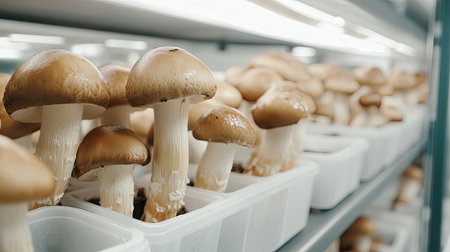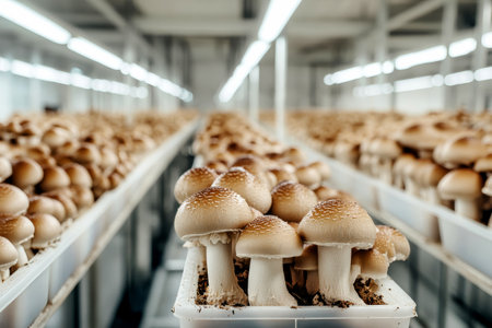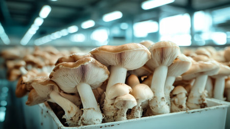 Mushrooms thrive in a bright, modern farm environment, highlighting advanced cultivation techniques and the beauty of indoor farming.