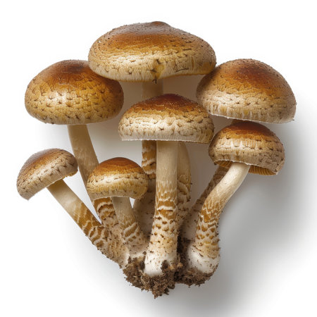 mushrooms, a type of edible fungi, are showcased in this high-resolution png image, featuring a stunning close-up view from directly above, set against a crisp white background, highlighting their unique shapes, textures, and earthy tones, perfect for culinary, botanical, or nature-inspired designs. ai generated
