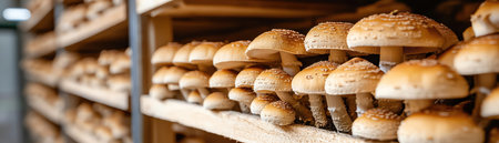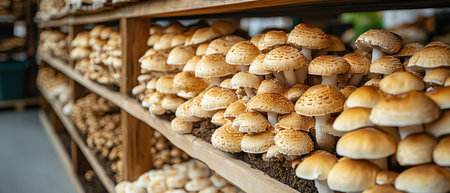 This image features freshly harvested mushrooms arranged on shelves inside a hydroponic farming setup. The bright lighting emphasizes the quality and freshness of the produce, ideal for culinary use.