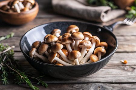 Fresh shimeji mushrooms in a bowl on rustic wooden background