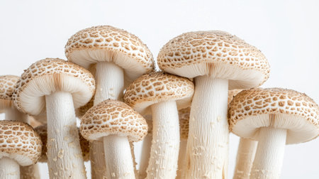 A neat cluster of shiitake mushrooms standing upright on a white background, with their unique caps creating an interesting visual contrast.