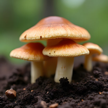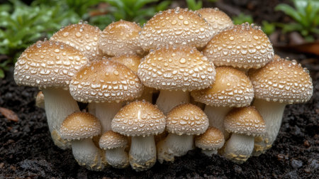 A group of mushrooms with droplets of water on their caps, surrounded by rich, dark soil, capturing the freshness of nature