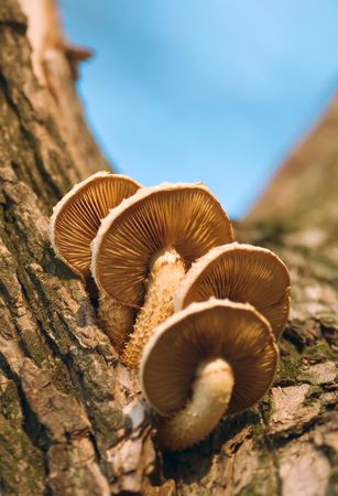 Close-up of shiitake mushrooms growing on a log or substrate, highlighting their natural growing environment and the texture of their caps and stems.