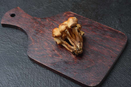 raw mushrooms honey mushrooms lie on a wooden table on a tablecloth close-up, food