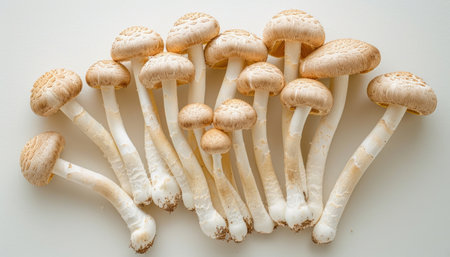 A cluster of Shimeji mushrooms arranged artistically on a pristine white surface, creating a balanced and aesthetically pleasing layout.