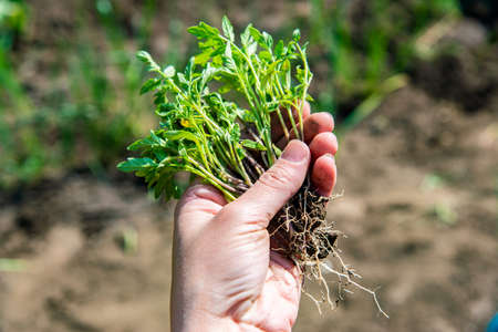 A woman holds in her hand a tomato seedling with roots for planting and growing a tomato.
