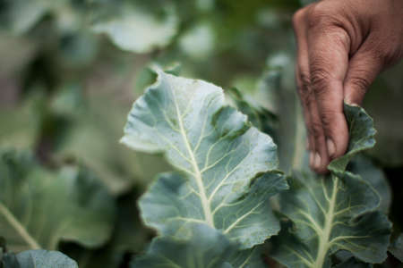 cropped view of farmer planting cauliflowers in vegetable garden
