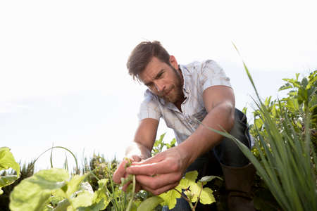 Mature man tending to plants in garden
