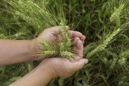 Farmers hand holding a green ears of barley. Agriculture. The concept of agriculture, healthy eating, organic food.