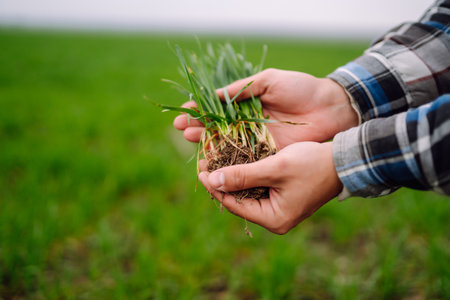 Young wheat sprout in the hands of a farmer. Checking wheat field progress. organic gardening.