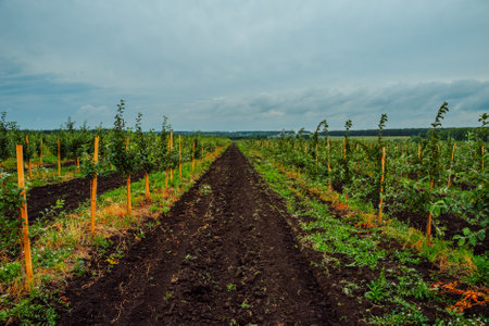 Apple Tree Orchard. Rows of apple trees grow. New apple trees