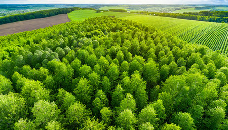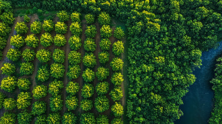 An aerial view of a reforestation project, with rows of newly planted trees, symbolizing hope and the vital role of forests in maintaining ecological balance.
