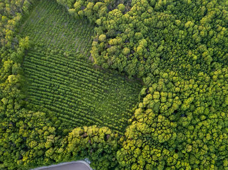 Aerial view of plantations of young trees in the forest, deforestation and planting of new trees