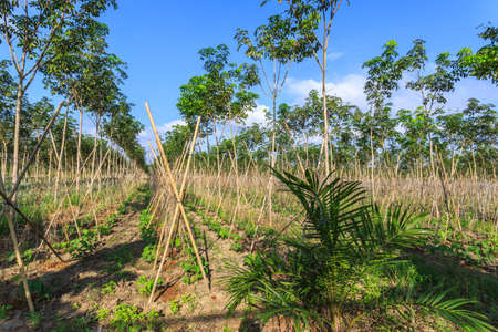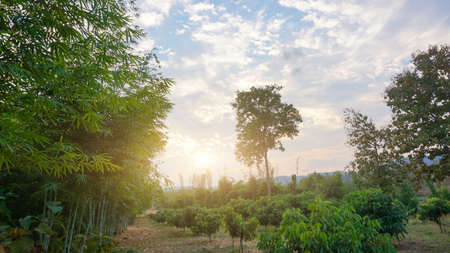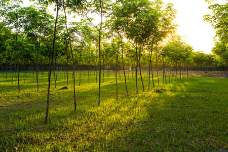 Rubber trees Plantation with sunrise and Season rubber trees change leaves