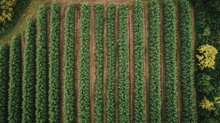 An aerial view showcases vibrant rows of crops in a well-maintained agricultural landscape, highlighting the harmony between nature and farming practices.