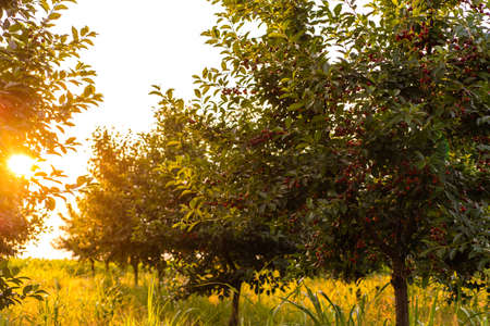 Cherries on orchard tree in sunset