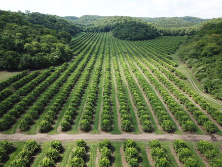 Aerial view of rows of trees in an orchard. Drone photography