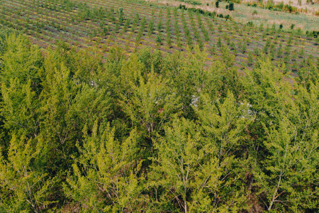 Reforestation concept, aerial view of poplar tree woodland with small saplings in background, drone pov