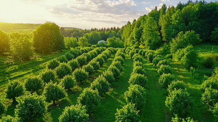 A picturesque aerial view of a lush green orchard at golden hour, showcasing rows of healthy trees surrounded by vibrant foliage under a clear sky.