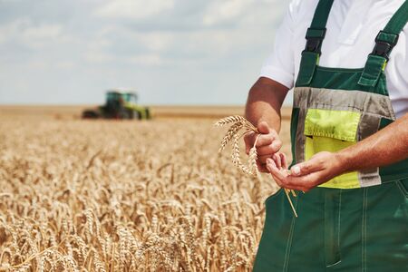 Worker in uniform stands in the filed and shows pod of wheat. Combine harvester behind.