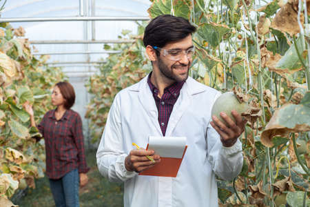 Portrait of a male researcher examining the quality of a melon plantation in a large greenhouse.