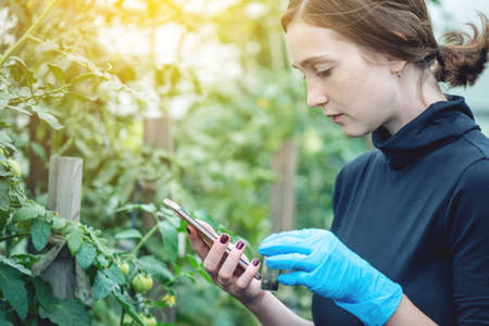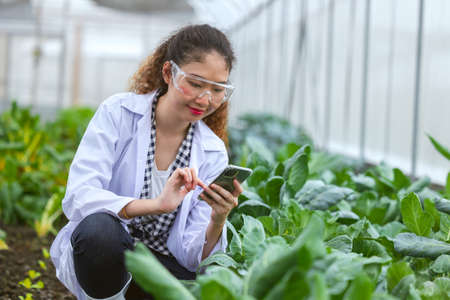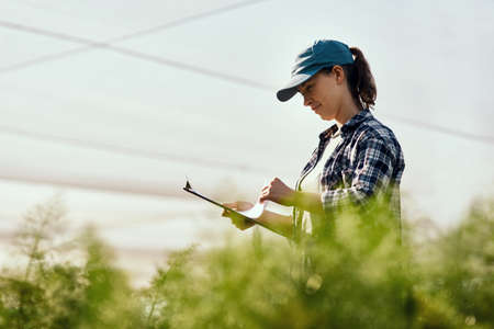 Scientist woman researcher staff worker collecting study plant information in agriculture farm. Agricultural Science concept.