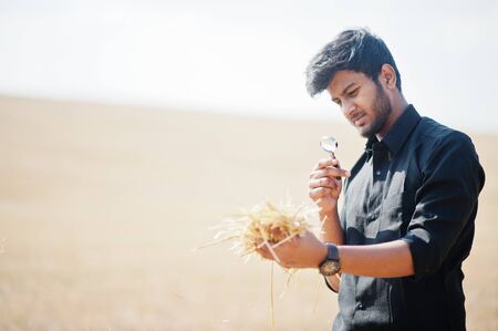 South asian agronomist farmer inspecting wheat field farm. Agriculture production concept.