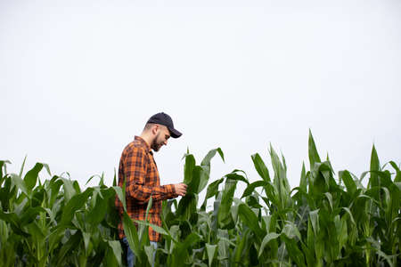 The farmer carefully inspects the corn and checks for pests. Copyspace