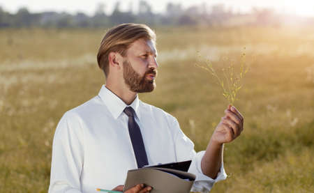 Agricultural engineer holding plant and examining it making notes standing in ripe field