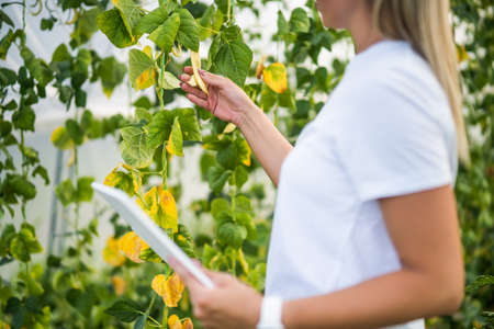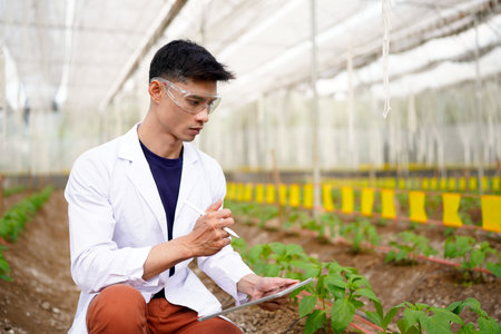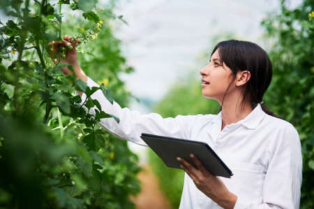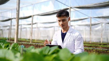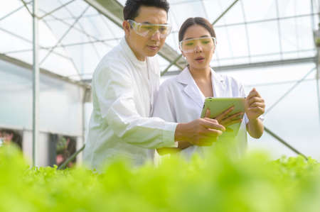 Scientist working in hydroponic greenhouse farm, clean food and food science concept